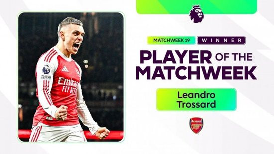 英超官方写道:“阿森纳前锋特罗萨德当选英超第19轮周最佳球员。”